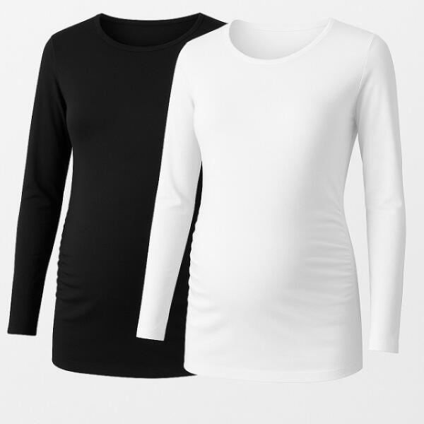 Praktikus, két darabos kismama felső szett, amely tartalmaz egy klasszikus fekete és egy letisztult fehér hosszú ujjú felsőt. A rugalmas, puha anyag és az oldalsó ráncolás kényelmes viseletet biztosít a várandóssá